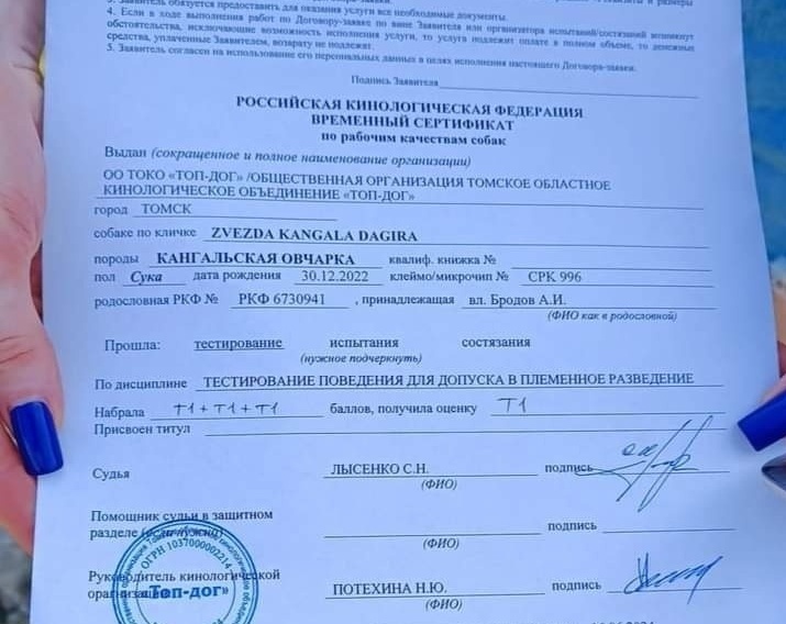 И еще одна наша выпускница, дочь Дамиры, получила свой первый взрослый титул кандидата в Чемпионы России - Звезда Кангала Дагира, она отлично показала себя в промежуточном классе на Национальной выставке САС-ЧФ "Кубок Ареса" в г. Красноярск. Результаты выставки - отл, САС, ПК, ЛПП, ЧФ. Наши поздравления!